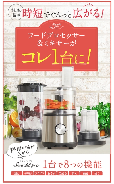 フードプロセッサーとミキサーが一体化し、みじん切り、千切り、大根おろし、離乳食作り、スムージー作りなど、幅広い料理を時短で簡単に作ることができるマルチブレンダーです。