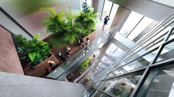 本計画建物は、熱負荷の低減や調光制御、排熱利用のほか、建物内のVOID 空間(吹き抜け)を活用した自然換気システムなど、さまざまな省CO₂技術を導入する先進の環境配慮型建築物です。