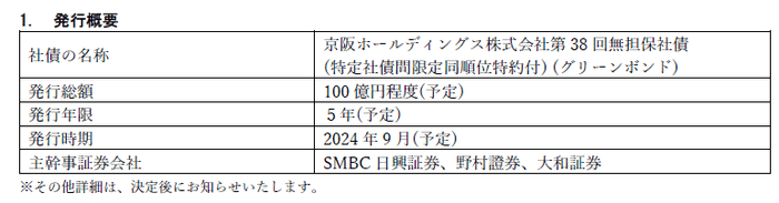 京阪ホールディングス株式会社(本社:大阪市中央区、社長:石丸昌宏、以下「当社」)は、環境の持続可能性に貢献する事業の資金調達手段として、当社初のグリーンボンドを2024年9月に発行いたします。
