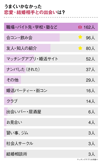 次に多かったのは「合コン・飲み会」で19.0%、「友人・知人の紹介」で15.9%、「マッチングアプリ・婚活サイト」で10.3%と続き、うまくいった恋愛と大きく変わらない結果となりました。