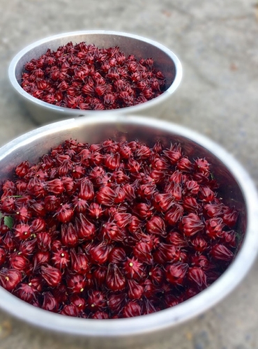 アスマイルジャパンでは、無農薬で太陽の陽をたくさん浴びて育った食用に適したローゼルを使っています。花が散り1個月程たつと、ガクが大きく膨らみ、ひとつずつ手摘みで收穫し、手作業で種を取り、選別しています。栽培に適した風土で、農薬を使わず育てているので、安心して丸ごとお召し上がりいただけます。