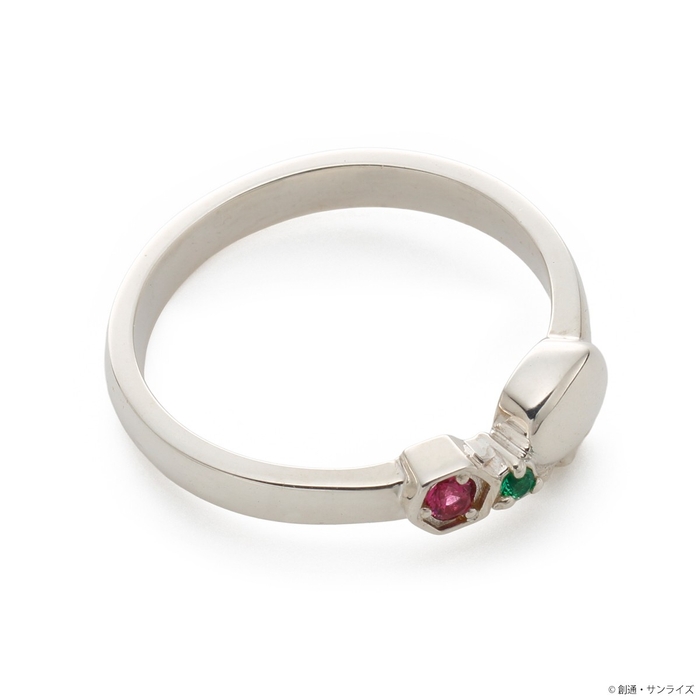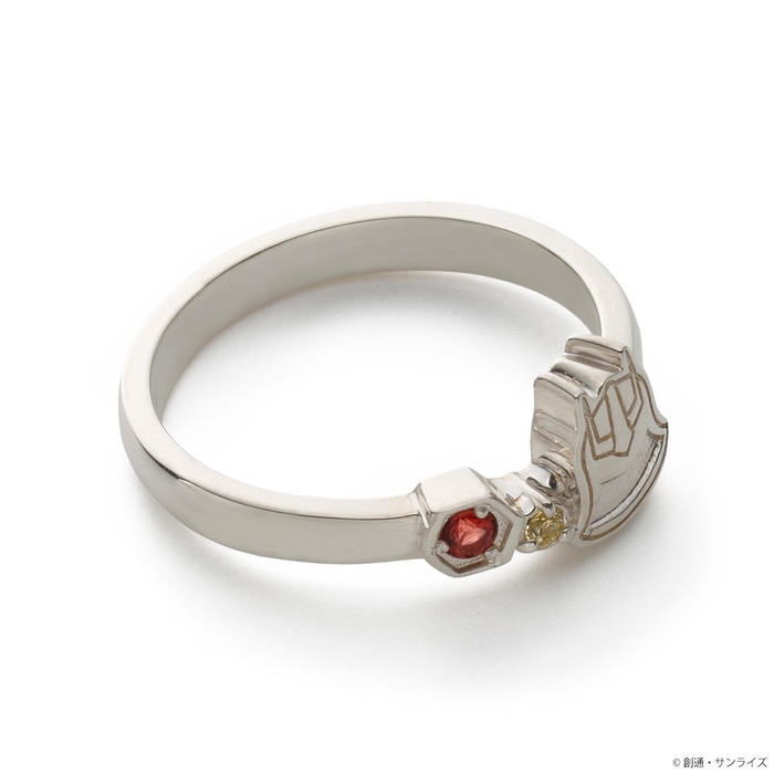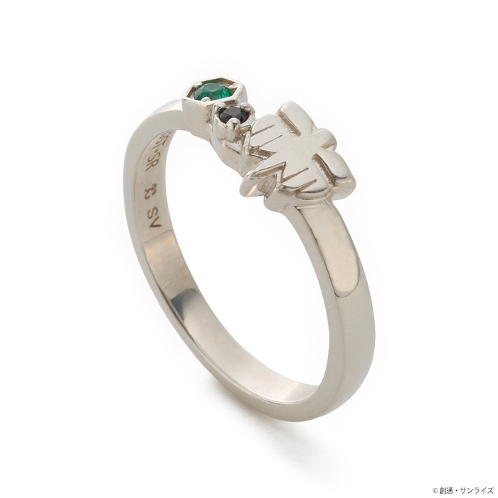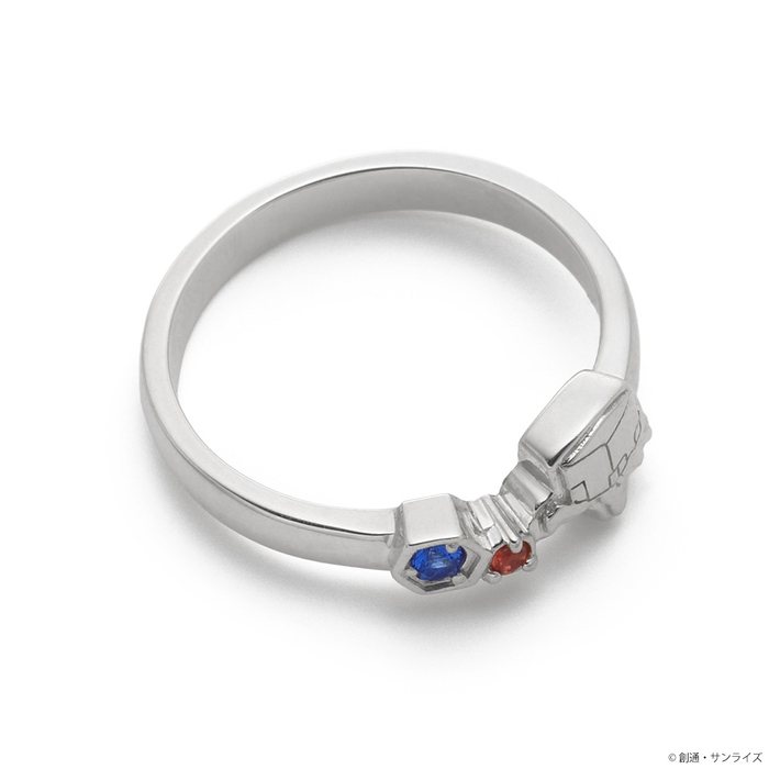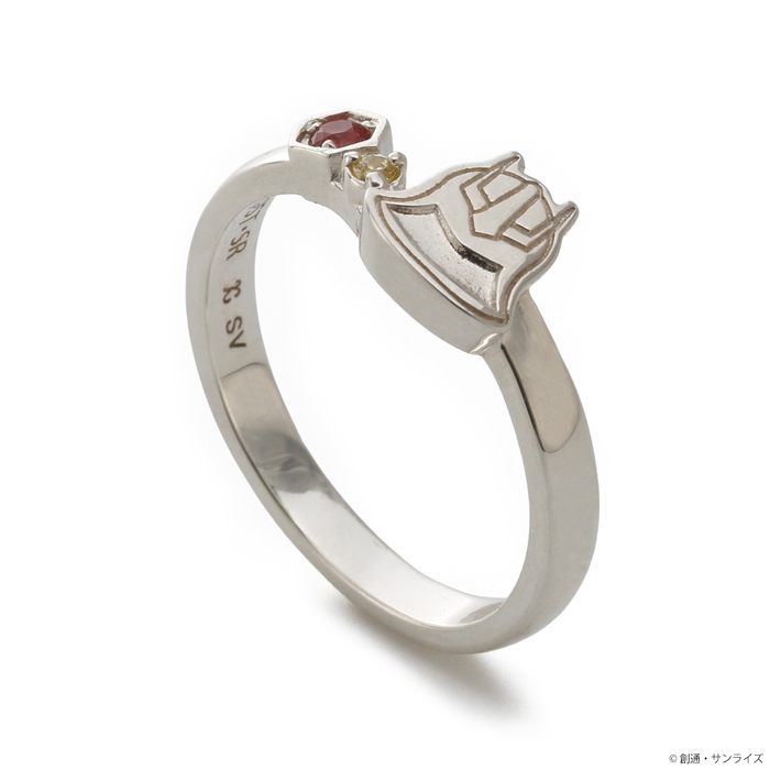 『機動戦士Gundam GQuuuuuuX』のシャリア・ブルをイメージしたシルバーリングです。中佐の胸章をモチーフに取り込んだゆるやかなV字ラインのデザインにイメージカラーストーンを2石セットしました。