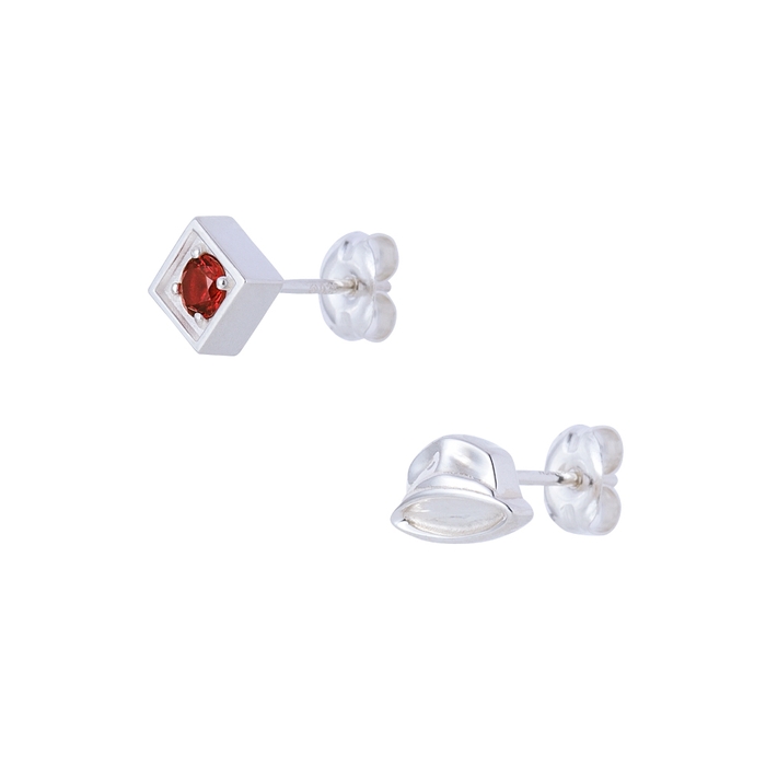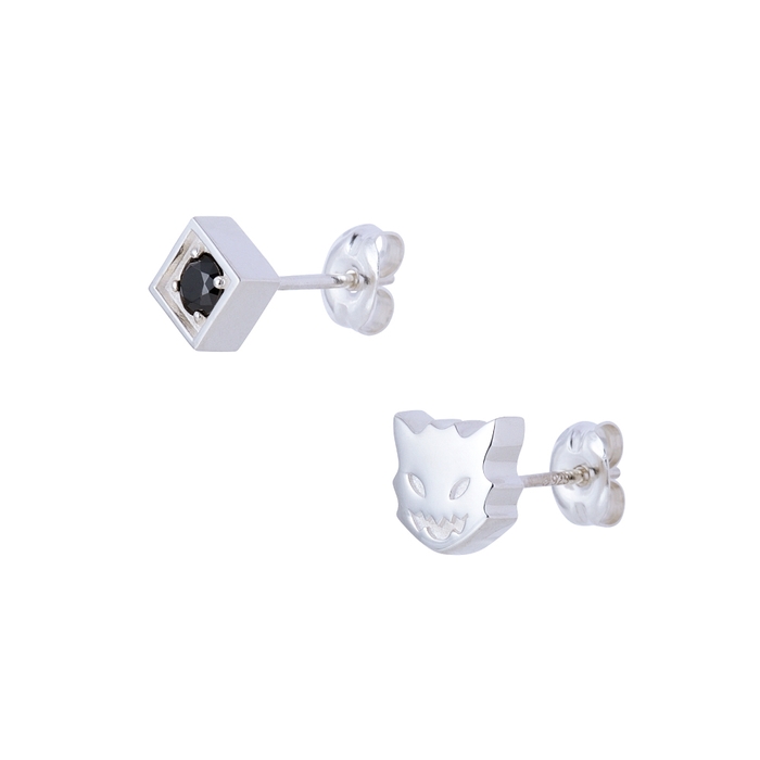 片方は帽子のモチーフ、もう一方はスクエア型の台座にイメージカラーストーンをセットしたアシンメトリーなデザイン。