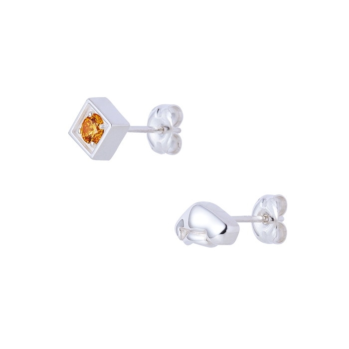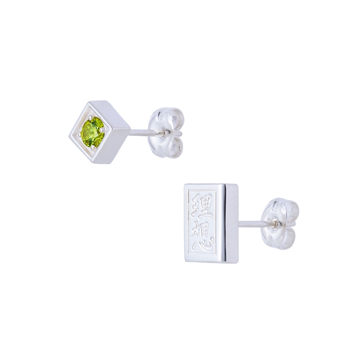 片方は手帳のモチーフ、もう一方はスクエア型の台座にイメージカラーストーンをセットしたアシンメトリーなデザイン。