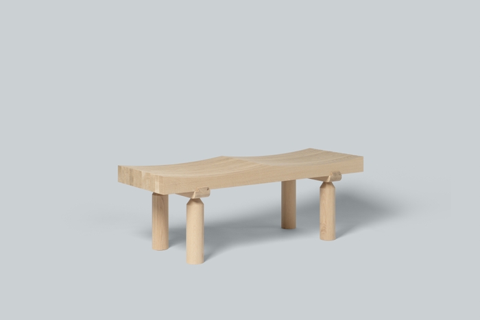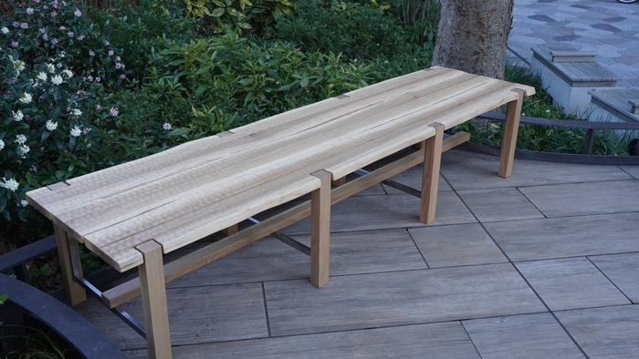 東川町に生えていた樹齢200年を超えるミズナラの木でつくったベンチです。木工の町東川町をあらわす家具となるよう、高い木工技術を表現するために蟻桟という木組を使い、この仕口がベンチの一番の特徴となっています。丸い脚と緩やかな曲線の座面、そして蟻組は日本の社寺建築の雰囲気を醸し出します。海外から多くの観光客が訪れる、日本の玄関口である東京トーチパークにふさわしいベンチとなるよう、日本文化を感じられるデザインとしました。