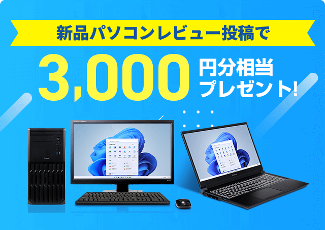 期間中、パソコン工房WEB通販サイトで新品パソコンの購入レビューを当社指定のテンプレートを使用し投稿いただいたWEB会員様にもれなくWEBポイント3,000円分相当をプレゼント