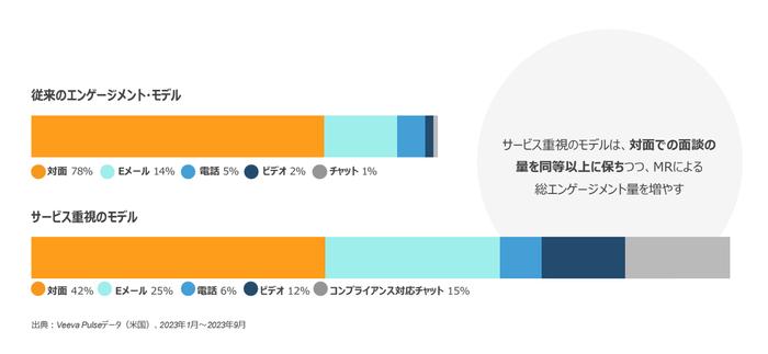 Veeva Systems【NYSE:VEEV】(本社:カリフォルニア州プレザントン、日本法人本社:東京都渋谷区、日本法人代表取締役:Sebastian Bather、以下Veeva)は、本日Veeva Pulseフィールドトレンドレポートの最新分析を発表し、双方向のデジタルコミュニケーションチャネルが現場のエンゲージメントに与える影響を示しました。その結果、コンプライアンス対応チャットへのアクセスがエンゲージメントチャネルミックスを拡大し、医師とのデジタルタッチポイントを2倍以上に増加させる一方で、対面での面談を維持または増加させることが明らかになりました。