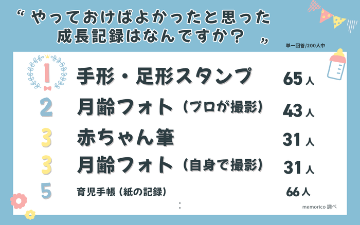 また、やっておけばよかった成長記録として、「手形・足形スタンプ」が一番多く、次いで「月齢フォト(プロカメラマンの撮影)」、「赤ちゃん筆」「月齢フォト(自身での撮影)」と続く結果となりました。