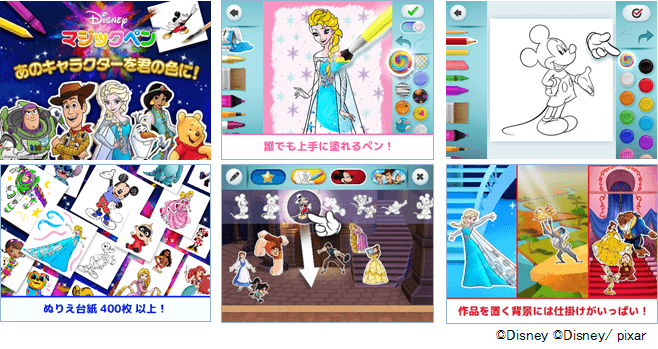 400種類以上のぬりえ台紙と、色鉛筆やクレヨン、ミッキーのシルエットパターン柄ブラシなど多彩なツールが用意されており、キャラクター本来の色やデザインにとらわれず自由にぬりえを楽しむことで、お子様の発想力や個性を育みます。色付けしたキャラクターはコレクションとして、ディズニーやピクサーの世界観を表現したドールハウス風の背景にセットして楽しむことが出来、配置によって様々なアクションや音声が楽しめます。さらに、背景のいたるところに隠された「ひみつ」をタップで見つけ出したり、画面をなぞるだけでお手本通り色を塗ることが出来るアシスト機能など、複雑な操作が難しい小さなお子様も楽しめる仕掛けを取り入れています。