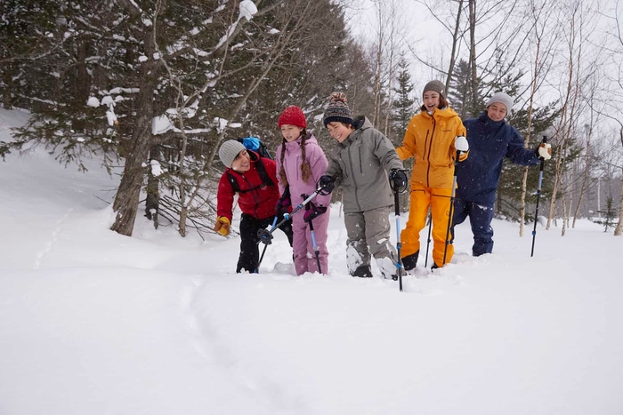 スノーシューを装着し、森の中の大冒険を楽しみます。定められた道がなく、どちらに進むか考えたり、途中で方向転換したりと、自ら道を考え、進んでいく体験です。家族で参加の場合は、意見を出し合う中で、子どもの考える力を養うことにも繋がります。また、辺り一面がふわふわなパウダースノーなので、スノーシューの扱いも自由自在。傾斜のある場所では、爽快な気分で走って駆け下りる「スノーシューダウンヒル」がおすすめです。さらに、うさぎや鹿などの足跡など、野生動物の痕跡も見られます。