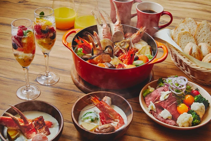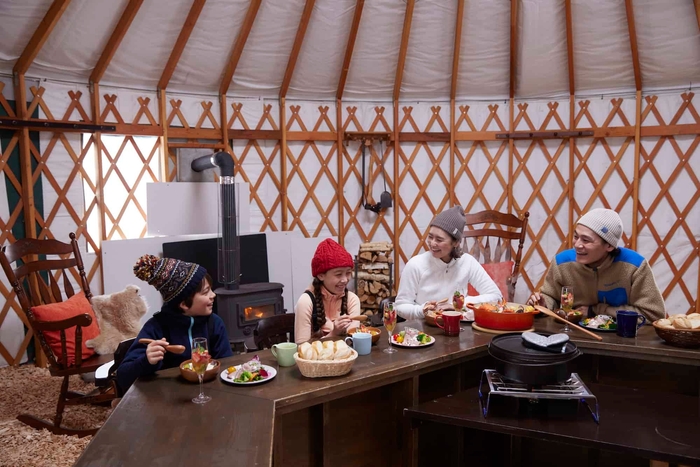 スノーシューのあとは、山奥に佇む大型テント「パオ」で身体が温まるランチを楽しみます。パオは、薪ストーブの火により、優しい暖かさに包まれた空間です。メニューは、シチューやサラダ、パン、フルーツ、ドリンクです。シチューには、蟹や海老、ホタテ、あさりなど北海道ならではの海産物をふんだんに使用。ファーム星野(*5)のトマム牛乳(*6)を使い、濃厚な味に仕上げました。雪山でアグレッシブに動いた身体を温め、ほっと一息つけるひとときを過ごせます。