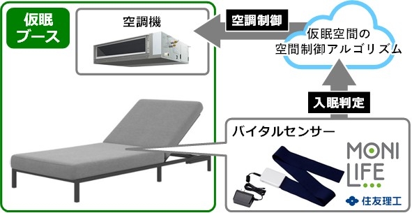 仮眠ブースに設置したバイタルセンサーが仮眠ブース使用者の入眠を判定し、仮眠空間の空間制御アルゴリズムにより、睡眠の3段階の状態に応じた温度制御を実施。