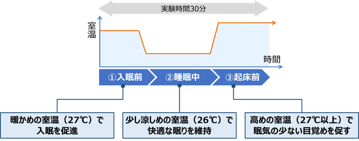 ①入眠前 … 入眠前の室温を「低め(25℃以下)・中立(26℃)・高め(27℃)」の3通りに設定し、それぞれの温度環境で入眠に要した時間を評価。