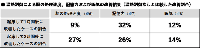 最も良好な睡眠状態が得られる温熱制御で実験した約50のケースにおいて、温熱制御を実施しない場合と比べて、脳の処理速度と記憶力のパフォーマンス向上に寄与する結果が得られた。