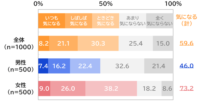 気になる人の割合を男女別にみると、男性では46.0%、女性では73.2%と、女性のほうが30ポイント近く高くなりました。