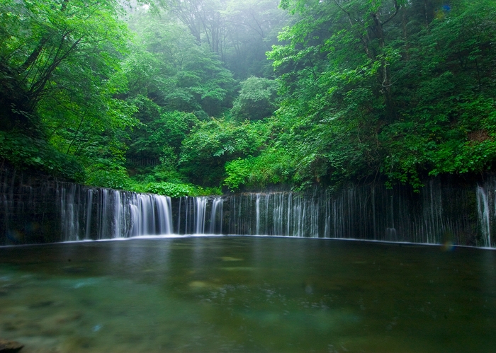 高さ3m、幅70mの湾曲した滝は、白糸のような水が幾重にも流れ落ちるように見えることからこの名前が付いたと言われていまする。夏には滝をスクリーンにした幻想的なプロジェクションマッピングが開催される他、紅葉や冬の季節もそれぞれ違った景色を楽しめます。