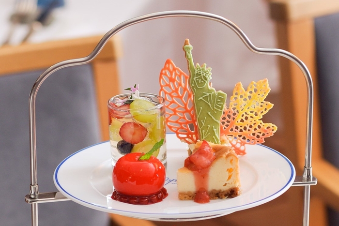 セントラルパークの紅葉をイメージした葉形のチュイルと、有機人参のキャロットケーキ。マンハッタンの人気店からインスピレーションを受けた、ニューヨークチーズケーキ。リンゴの美味しさを詰め込んで、艶やかに仕上げたビッグアップル、タイムズスクエアの煌めきをモチーフにしたフルーツのジュレなどが華やかに並びます。