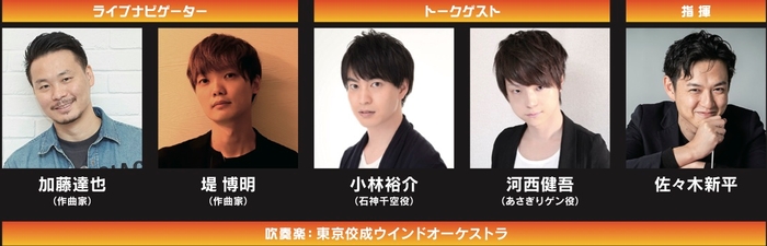 さらに加藤達也、堤博明がナビゲーターとして楽曲解説を行い、観客を『Dr.STONE』の世界により深く誘います。また、『Dr.STONE』キャストの、小林裕介(石神千空役)、河西健吾(あさぎりゲン役)の登壇も決定!彼らによる熱いトークと生演奏でしか感じられない迫力をぜひお楽しみください!