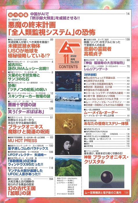 特別企画 未確認潜水物体USOが地球を極秘侵略している⁉/加古川に謎のUMAムッシー出現‼/火星のヒモ状生物とサンゴの化石/実用スペシャル ブラックオニキス 魔除けと開運の呪術/特別とじ込み付録 神聖ブッラックオニキス・クリスタル/量子消しゴムのパラドックス/UFOディレクター 矢追純一/「弥勒菩薩」の正体はウィンドウズ95だった‼/幻の古代王国「加耶」の謎/ほか