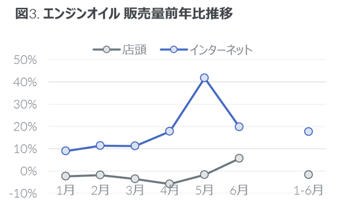 4L缶は数量前年比1%減であったが、インターネットでは同2%増と微増であった。店頭は4L缶全体では同2%減と落ち込んだなか、全合成油は同4%増と伸長した。平均価格は、店頭では3,611円と前年から横ばいであったことに対して、インターネットでは販売数量の8割を占める全合成油の価格が上昇したことで、前年同期から9%上昇した。結果、インターネットの金額前年比は11%増と二桁成長となった。
