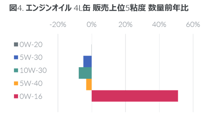 4L缶では0W-20の販売が最も多く、数量ベースで41%を占めた。対して、5W-30の数量構成比は前年同期の23%から22%に、10W-30は15%から14%に縮小した。こうした中、0W-16の販売が好調で数量前年比は51%増に達し(図4)、数量構成比は2%から4%に拡大した。