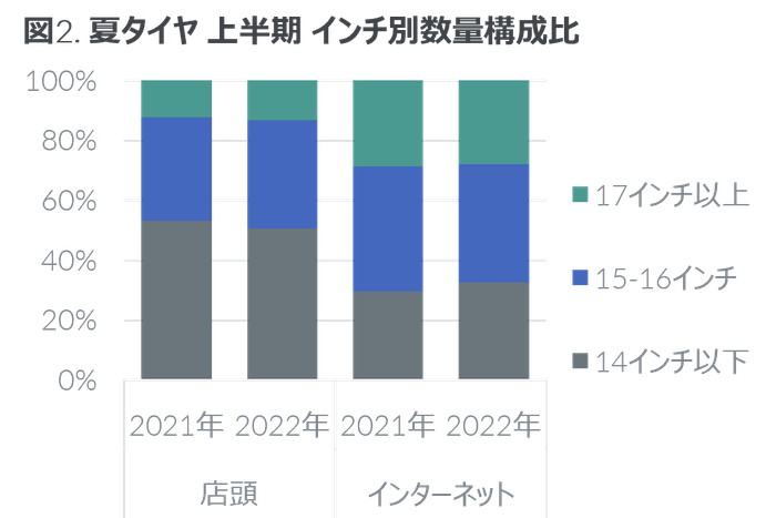 夏タイヤのサイズ構成をみると、店頭とインターネットで対照的な傾向がみられた。店頭では高インチの販売が拡大しており、17インチ以上の数量構成比は前年同期の12%から13%に拡大した(図2)。ただ店頭では14インチや15インチが引き続き主流であり、155/65/14では数量ベースで21%、195/65/15では7%を占めた。インターネットでは軽自動車に多く採用される14インチ以下が伸びており、2022年上半期の数量構成比は前年同期の29%から33%に拡大した。特に155/65/14の伸びは著しく、販売本数は前年同期の1.8倍に達した。