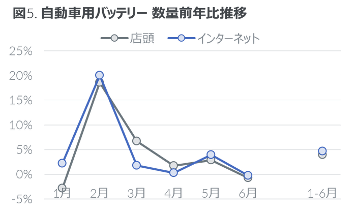 2022年上半期の数量前年比は4%増で、店頭では同4%増、インターネットでは同5%増であった(図5)。月別にみると、昨年より気温が低かった2月は店頭では数量前年比19%、インターネットでは同20%増と大幅に増加した。店頭ではハイブリッド車向け製品が好調で数量前年比26%増と大きく伸長したことで、店頭の平均価格は13,432円と3%上昇した。インターネットではアイドリングストップ車向け製品の価格上昇の影響が大きく、平均価格は9,550円と3%上昇した。結果、金額前年比は店頭では7%増、インターネットでは8%増と堅調であった。