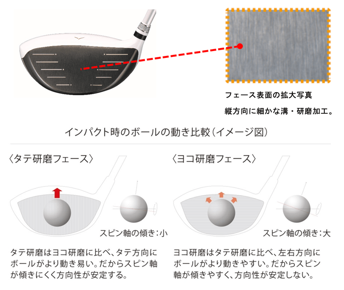 さらに、ドライバーには「バーティカルポリッシュ(縦研磨)」フェース、フェアウェイウッドとユーティリティーには斜め溝・斜め研磨フェースを採用。クラブごとに最適なフェース設計により、スピン軸の傾きを抑制し、サイドスピンを減少させ、方向安定性が向上します。