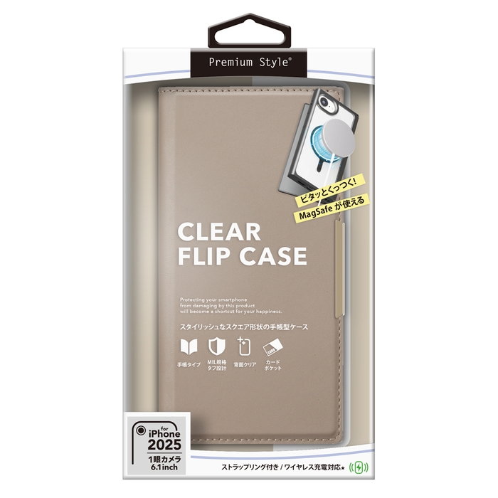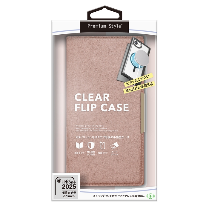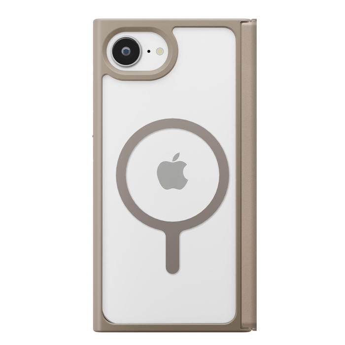 MagSafe対応メタルリングを内蔵したiPhone 16e用 クリアフリップケースです。