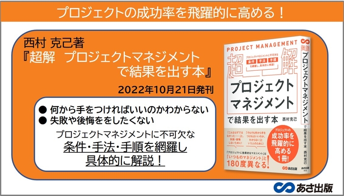 株式会社あさ出版(代表取締役:田賀井弘毅、所在地:東京都豊島区)は西村克己著『超解 プロジェクトマネジメントで結果を出す本』http://www.asa21.com/book/b611652.htmlを2022年10月21日(金)に刊行いたします。