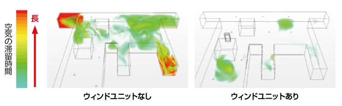 ウィンドユニットを設置することで、空気の滞留時間を示す空気齢が改善しました。特に袋小路になっているエリアの空気の質の改善につながっています。