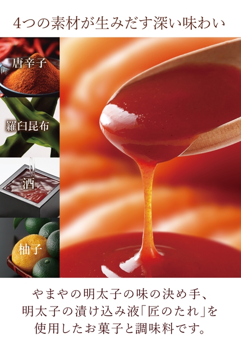 この「匠のたれ」をベースに味付けした、ピリッと辛い本格派の「めんたいせんべい」はお米の素材感を残し、パリッと香ばしく焼き上げました。同じく「匠のたれ」を使用した「めんたい辛みソース」は、明太子の旨みを凝縮した美味しさで、いろいろな料理にかけるだけで、旨みと辛みがアップ。明太子の旨みたっぷりの辛みソースで、卵かけご飯や唐揚げ、ラーメン、餃子にかけるだけで美味しくお召しあがりいただけます。