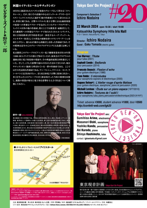 東京現音計画主催、『東京現音計画#20~コンポーザーズセレクション7:野平一郎』が2024年3月22日 (金)にかつしかシンフォニーヒルズ アイリスホール(東京都葛飾区立石六丁目33番1号)にて上演されます。