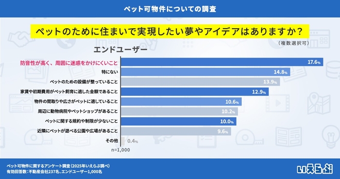 ペットを飼っている人にとってペット可物件の需要が高くなっている中、エンドユーザーに「ペットのための住まいで実現したい夢やアイデアはありますか?」という質問をしたところ、ペット可物件を選ぶ際に重視するポイントと同様、「防音性が高く、周囲に迷惑をかけにくいこと」が17.6%で最も多く、次いで「特にない」が14.8%、さらに「ペットのための設備が整っていること」が13.9%となりました。ペット可物件を選ぶ際に防音性を重視する傾向は、先の調査結果とも一致しており、需要が高いことが改めて確認されました。