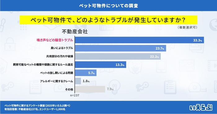 さらに、「ペット可物件で、どのようなトラブルが発生していますか?」という質問では、「鳴き声などの騒音トラブル」が33.3%で最も多く、次いで「臭いによるトラブル」が23.7%、「共用部分の汚れや破損」が22.2%という結果となりました。