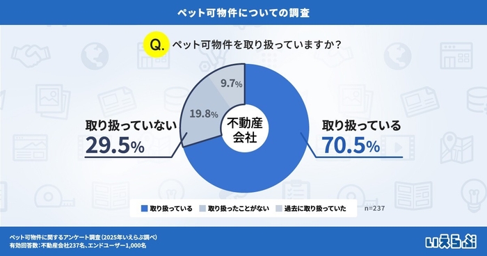 1.ペット可物件を取り扱っている不動産会社は70.5%、一方、希望エリアで物件がない・ペット可物件の情報が少ないと回答するエンドユーザーが、19.5%で同率1位