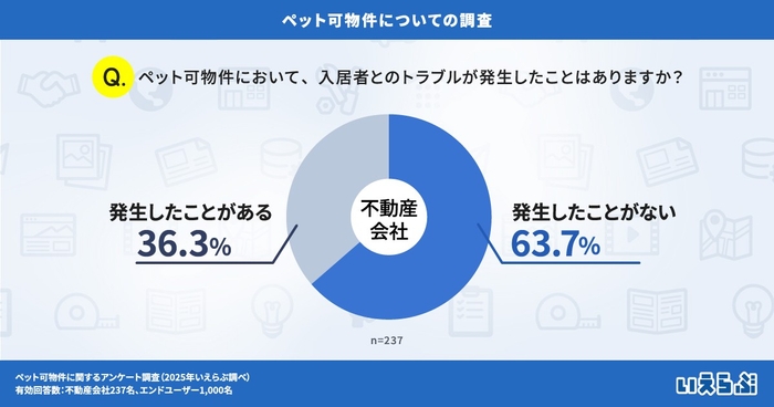 2.36.3%の不動産会社が入居者とのトラブルがあったと回答、ペット可物件でのトラブル第1位は、鳴き声などの騒音トラブル(33.3%)