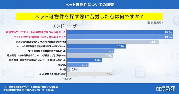 しかし、エンドユーザーへの調査では、ペット可物件の供給が十分とは言えない状況が浮き彫りになりました。「ペット可物件を探す際に苦労した点は何ですか?」という質問に対し、「希望するエリアでペット可物件が見つからなかった」、「ペット可物件の情報が少なく、探しにくかった」と回答した人が19.5%で最も多い結果となりました。