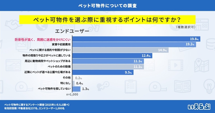 また、エンドユーザーへの「ペット可物件を選ぶ際に重視するポイントは何ですか?」という質問でも、「防音性が高く、周囲に迷惑をかけにくい」という回答が19.8%で最多となりました。この結果から、不動産会社とエンドユーザーの双方が、ペット可物件における騒音トラブルを重要視しており、防音性の高い物件へのニーズが高いことが明らかになりました。