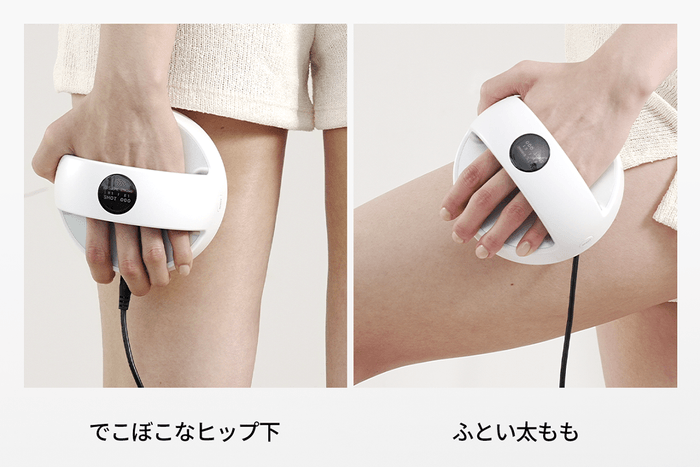 韓国クリニックやエステでの施術に着目し、自宅でいつでも安全に凸凹したセルライトにアプローチし、乱れたボディラインを美しいボディラインに導きます。AGE-RボディショットはRF(高周波)とEMS(中周波)技術を活用し、身体の気になる部位の脂肪を吸引することで肌弾力ケアおよびむくみ改善が期待できます。
