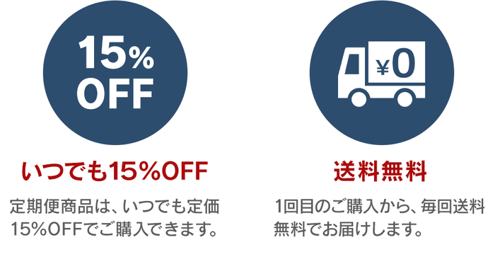 ご希望の商品を2~8週間、または12週間の周期からお選びいただき、自動的にお届けします。送料無料に加え、商品価格が毎回15%OFFになる、大変お得なサービスです。