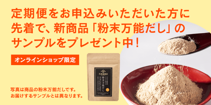 だしの定期便をお申込みをいただいた方に先着で、新商品「粉末万能だし」のサンプルをプレゼントいたします。新商品をひと足早くお試しできるこの機会をぜひ、お見逃しなく!