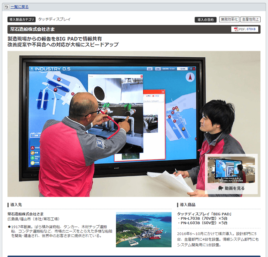 常石造船 「電子黒板BIG PAD」を活用した情報共有システムが導入事例として紹介