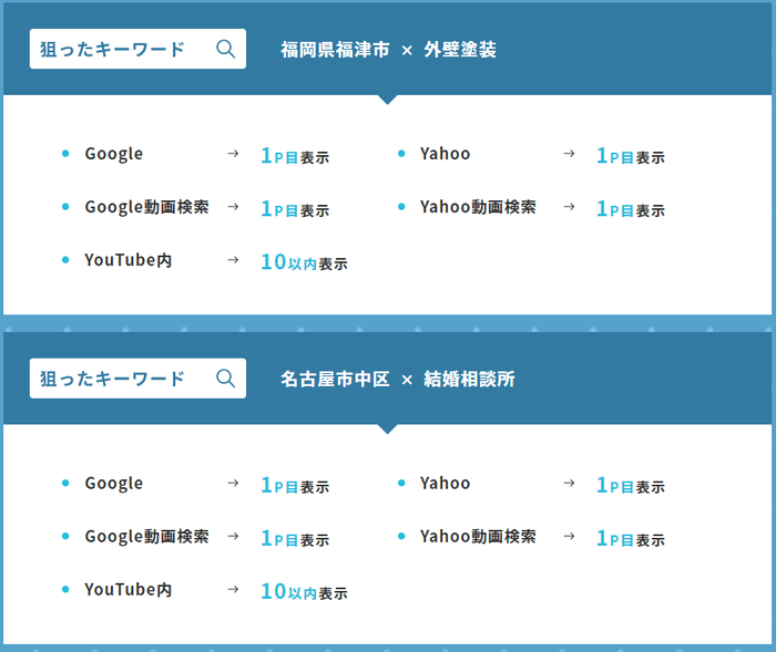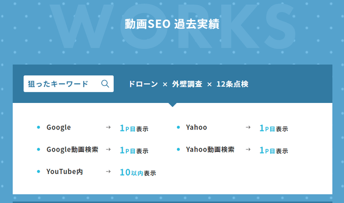 Google Yahooのキーワード検索のほかに、動画の特性上Google Yahooの動画絞り込み時の検索も対象になります。