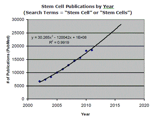 2011年の幹細胞研究用品の市場規模は10億3千万米ドルで、2010年の8億8千3百万米ドルから8.9% 成長しました。幹細胞市場は多項式成長曲線によるモデル化が最も適当であり2015年には13億5千万米ドルになると推計されます。