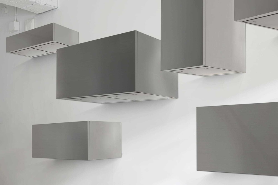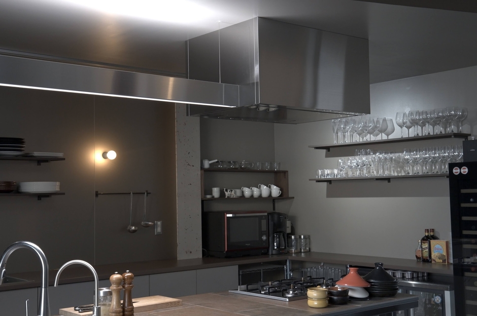 また、スイッチがレンジフード本体からなくなったことで、ステンレスのシンプルなキューブが空中に静かに佇んでいるだけという意匠に。レンジフードのサイズを大きくしても「設備機器」感を主張せず、空間にうまく馴染んでくれます。