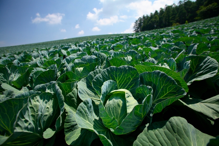 「高原キャベツ」を栽培している群馬県嬬恋村は標高700m~1,400mの高原地帯で6月~9月の気温が15~20℃と涼しく、昼夜の寒暖差、高原特有の朝露、年間降雨量の多さが特徴です。この嬬恋村で生産される夏秋キャベツは日本一の生産量を誇ります。