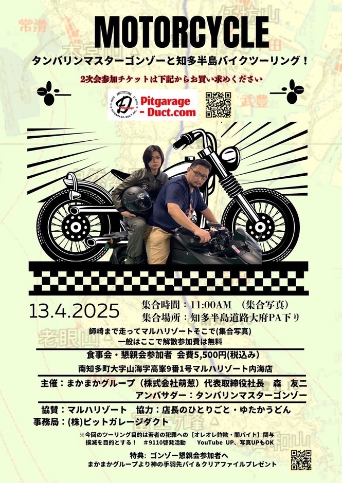 名古屋栄住吉エリアで飲食店舗を展開するまかまかグループ(運営:株式会社萌葱、代表取締役:森友二)は、若者の犯罪関与撲滅を目的とした#9110啓発運動(オレオレ詐欺、闇バイト)の第2弾として、アンバサダーのタンバリンマスターゴンゾーとのツーリングを2025年4月13日に開催します。
