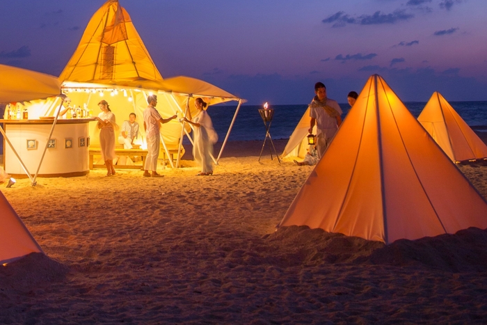 ビーチには、大切な人と2人きりで満天の星とクリスマスツリーを眺めることができるプライベートな空間のティピをご用意します。温かい光に包まれながら、大切な人と波音を聞き、珊瑚と白砂のツリーを眺めることができます。