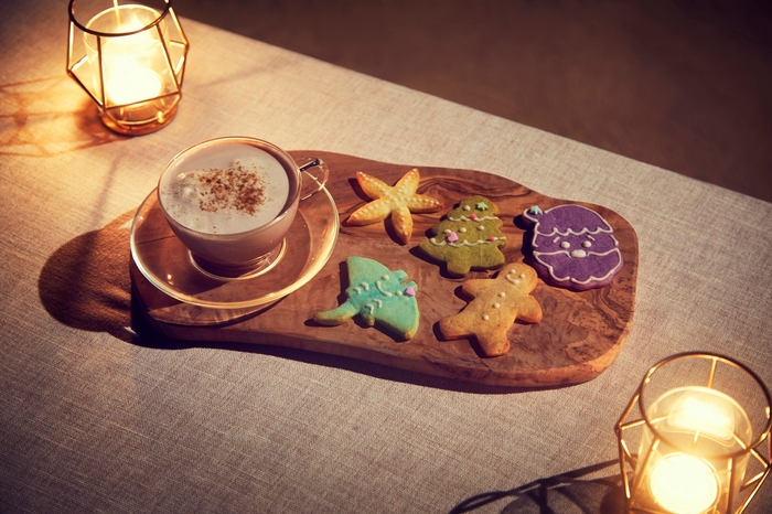 温かい黒糖ココアと、小浜島の海で出会えるマンタやヒトデの形や、クリスマスらしいサンタやツリーの形をしたオリジナルのジンジャークッキーでおもてなしをします。ジンジャークッキーには沖縄で親しまれている紅芋や長命草、ヒバーチと呼ばれる島胡椒などを使用しています。また、かりゆしウェア姿の「かりゆしサンタ」登場します。かりゆしサンタが、それぞれのティピに黒糖ココアとオリジナルのジンジャークッキーをお届けし、南の島のビーチクリスマスを盛り上げます。